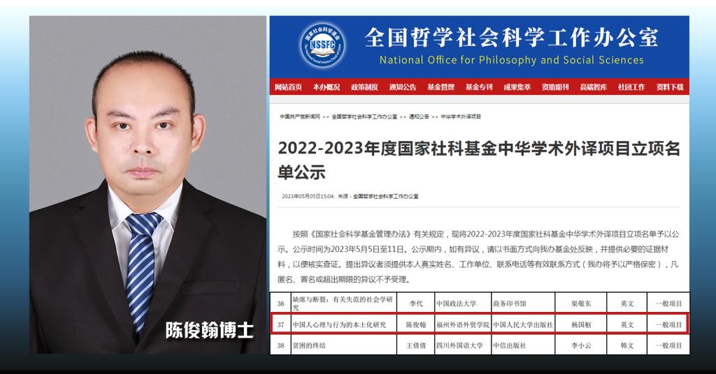 5月5日,全国哲学社会科学工作办公室公示了2022-2023年度国家社科基金中华学术外译项目立项名单。我校教育学院陈俊翰博士的《中国人心理与行为的本土化研究》在众多申报项目中脱颖而出。据了解,此次公示的国家社科基金中华学术外译项目共234项,福建省属高校仅获批两项。