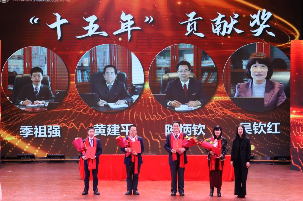 吴新星董事长为获得“福州外语外贸学院十五年、十年贡献奖”的20位教职工颁发了奖章证书,并发表了讲话。她指出,福外的成长一路伴随着挑战,但福外人始终勇于进取、善抓机遇,创造了许多辉煌。她强调,今年是全面贯彻落实党的二十大精神的开局之年,是福外向高水平应用型大学宏伟目标加速迈进的关键之年,是全体福外人全力以赴建好硕士学位培育单位的攻坚之年。她要求广大福外人要坚定申硕必胜信念,要坚持创新引领发展,要团结协作勇往直前,携手并进,共同创造福外新的辉煌。