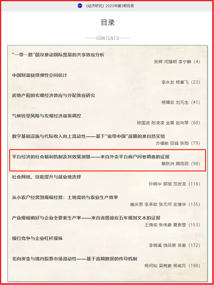 近日,我校北京研究院顾雨辰副教授与中国社会科学院蔡跃洲研究员合作完成的论文《平台经济的社会福利机制及其效果测算—来自外卖平台商户问卷调查的证据》在国内经济学顶级期刊《经济研究》2023年第5期正式发表。