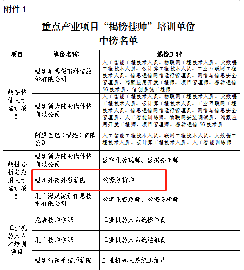 日前,福建省人力资源和社会保障厅发布《福建省人力资源和社会保障厅办公室开元网页版公布重点产业项目和重点群体项目“揭榜挂帅”职业技能培训中榜名单的通知》(闽人社办〔2023〕100号),我校中榜重点产业项目“揭榜挂帅”培训单位,中榜项目(工种)为“数据分析与应用人才培训项目(数据分析师)”。