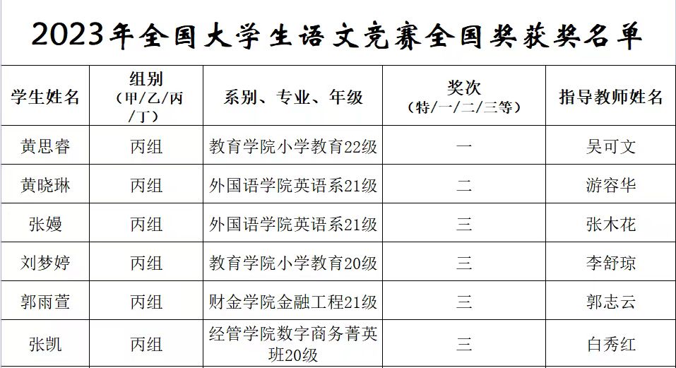 近日,2023年第四届全国大学生语文竞赛公布比赛结果,我校学子荣获一等奖1项,二等奖1项,三等奖4项,教师游容华还荣获优秀组织奖。