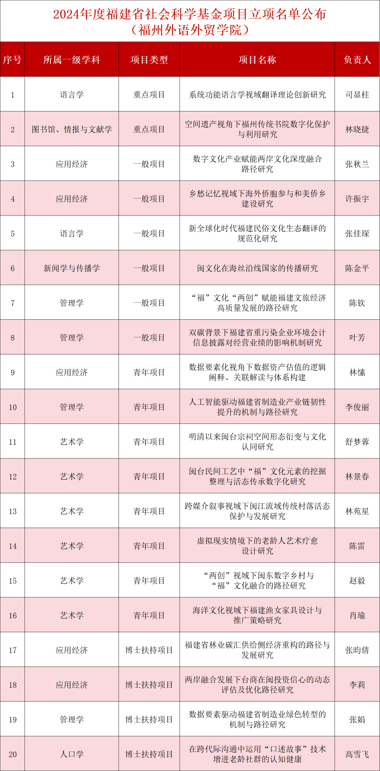 近日,福建省社会科学规划办公室公布了2024年度福建省社会科学基金项目立项名单,我校共获批立项20项,其中重点项目2项,一般项目6项,青年项目8项,博士扶持项目4项。我校立项项目数名列全省高校第8名,民办高校第1名。