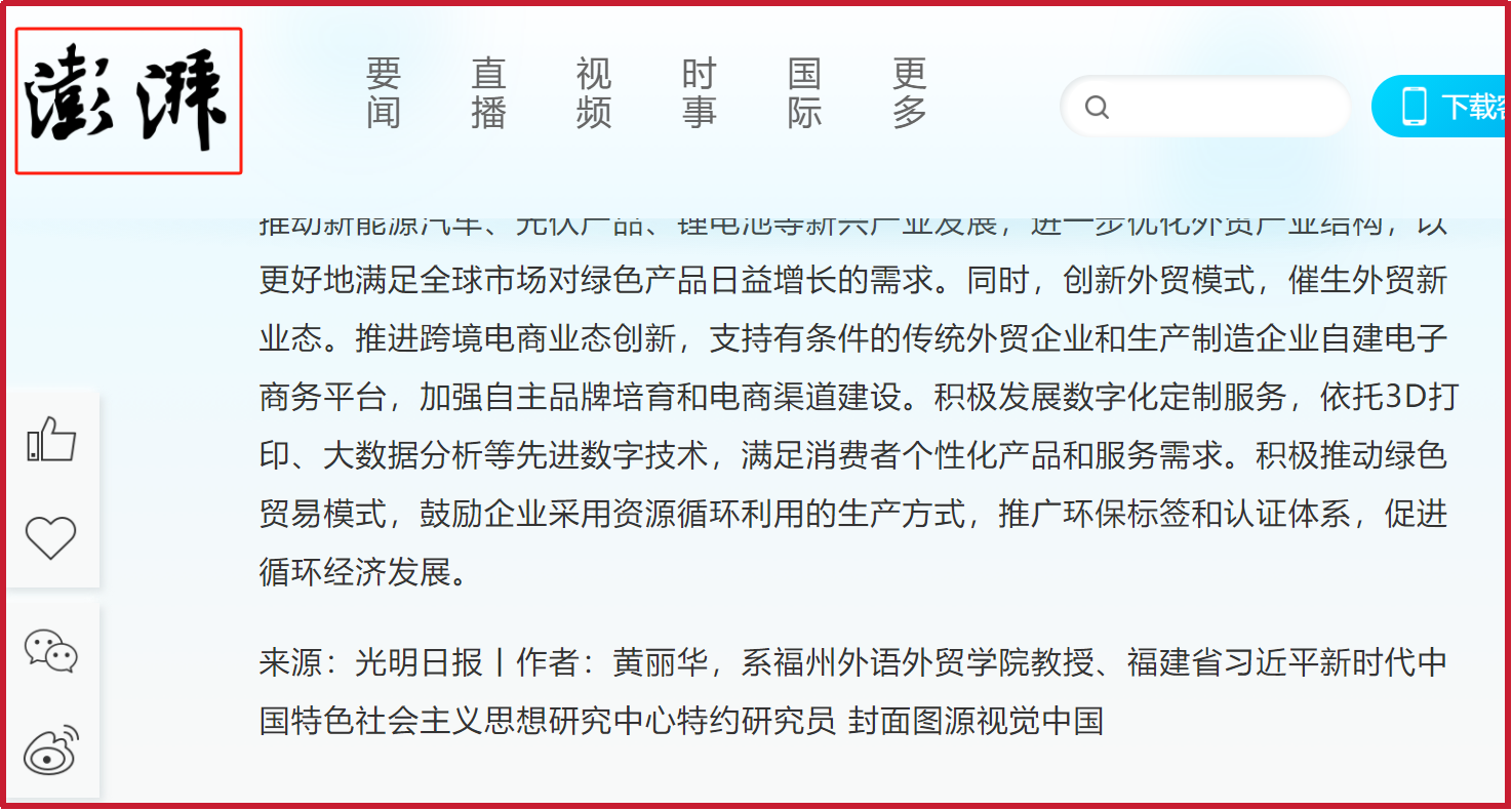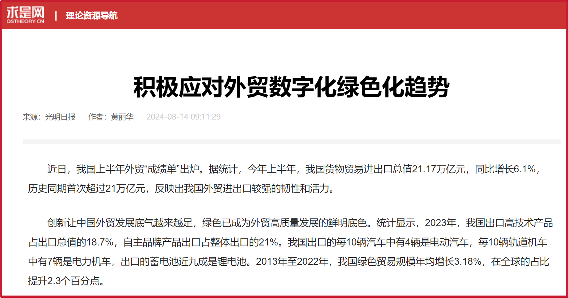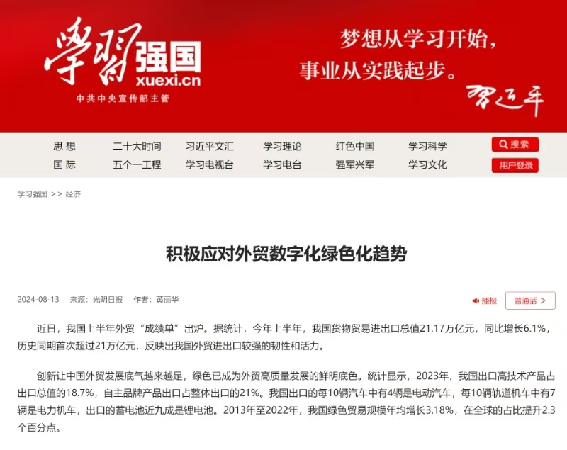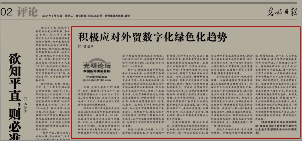 近日,《光明日报》刊登了我校黄丽华教授、福建省习近平新时代中国特色社会主义思想研究中心特约研究员的“积极应对外贸数字化绿色化趋势” 理论文章。文章根据《中共中央开元网页版进一步全面深化改革、推进中国式现代化的决定》就深化外贸体制改革作出重要部署和精神,在全面分析我国上半年外贸“成绩单”的基础上,提出:数字化、绿色化是国际贸易发展的方向和未来,也是外贸产品创新、结构升级的两大新动能;外贸数字化与绿色化转型,不仅助力塑造外贸新格局,还有利于赢得更多发展主动权、扩大市场影响力;进一步完善顶层设计、夯实绿色基建、加强跨界合作,从而推进产业转型、模式创新,将为外贸高质量发展注入更多新动能。