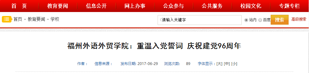 福建省教育厅网站报道:福州外语外贸学院:重温入党誓词 庆祝建党96周年