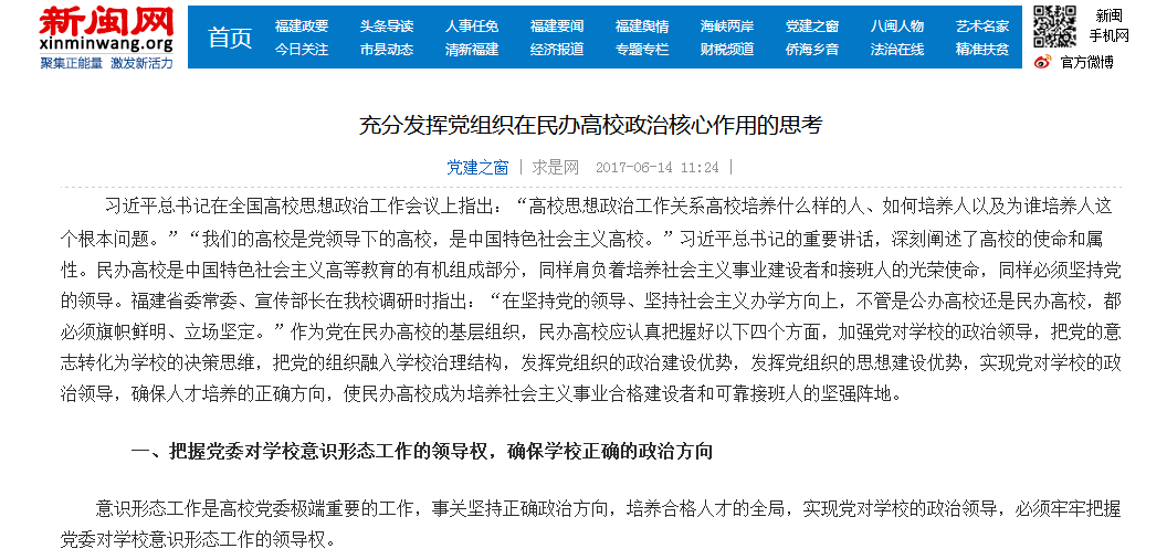新闽网报道:我校党委书记陈炳钦:充分发挥党组织在民办高校政治核心作用的思考