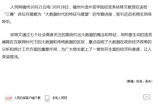 人民网报道:林筱文教授为福外师生解析“大数据时代的特征与展望”