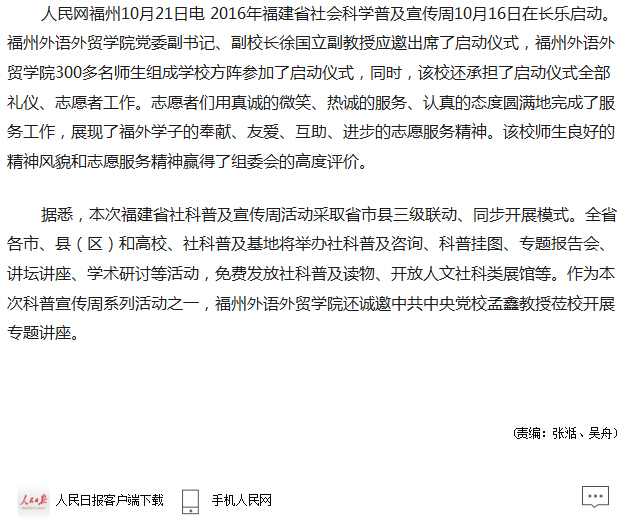 人民网报道:福州外语外贸学院师生参加2016年福建省社会科学普查周启动仪式