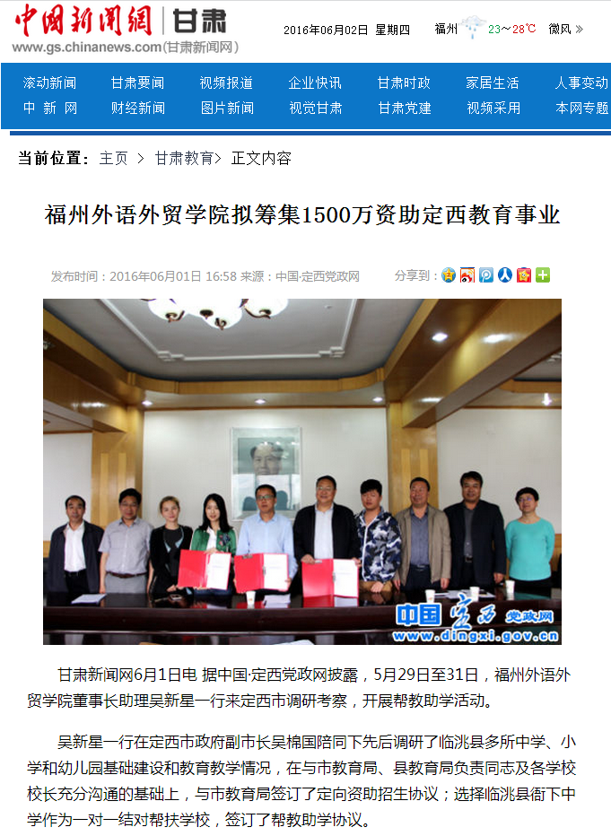 中国新闻网(甘肃)报道:福州外语外贸学院拟筹集1500万资助定西教育事业