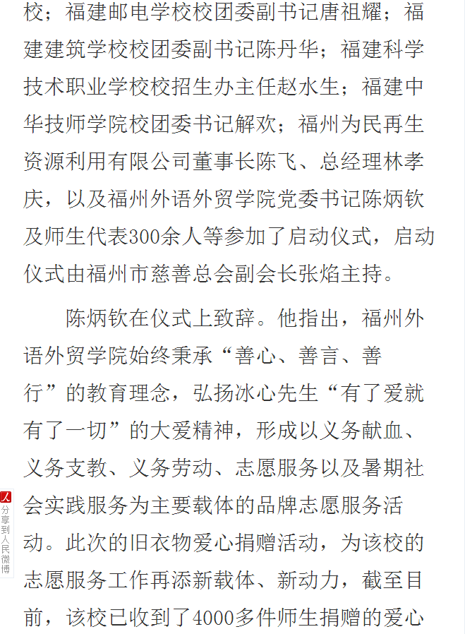 人民网报道:福州市慈善总会联手福州外语外贸学院启动旧衣物爱心捐赠活动