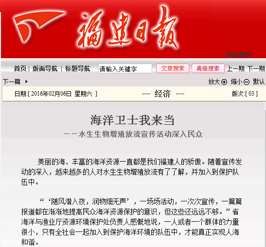 福建日报报道:海洋卫士我来当——水生生物增殖放流宣传活动深入民众