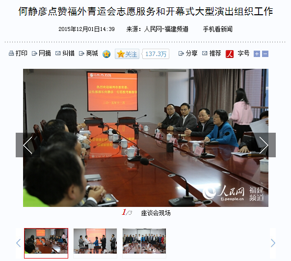 人民网报道:何静彦点赞福外青运会志愿服务和开幕式大型演出组织工作