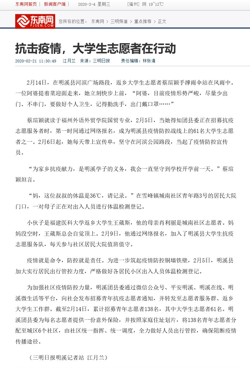 东南网报道:抗击疫情,大学生志愿者在行动