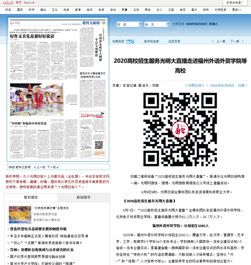 光明日报报道:2020高校招生服务光明大直播走进福州外语外贸学院等高校