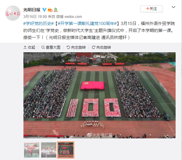 光明日报微博报道:开学第一课献礼建党100周年