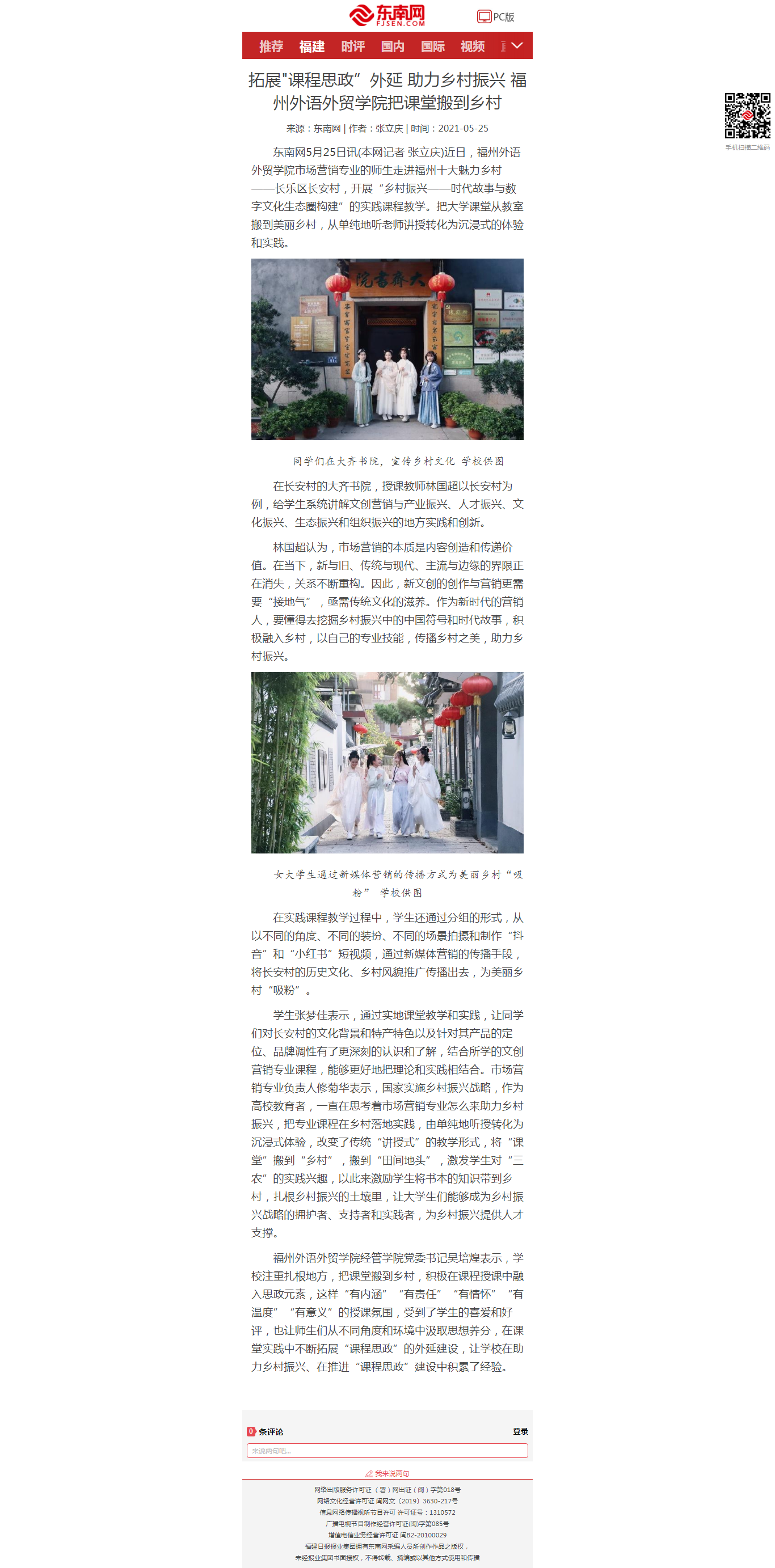 东南网报道:拓展"课程思政”外延 助力乡村振兴 福州外语外贸学院把课堂搬到乡村