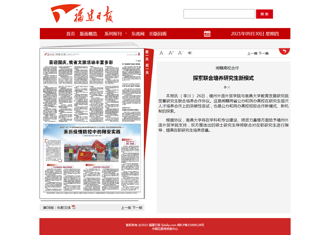 福建日报报道:闽赣高校合作 探索联合培养研究生新模式