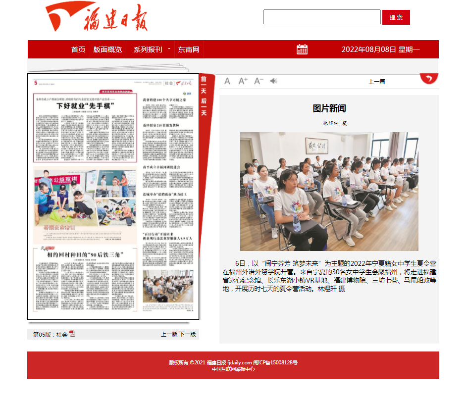 福建日报报导:“闽宁芬芳 筑梦未来”2022年宁夏籍女中学生夏令营在福州外语外贸学院开营