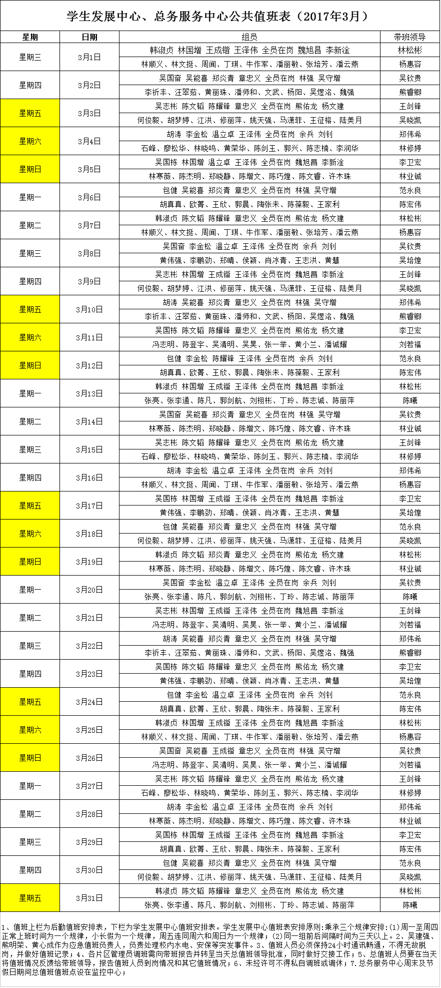 学生发展中心、总务服务中心公共值班表(2017年3月)