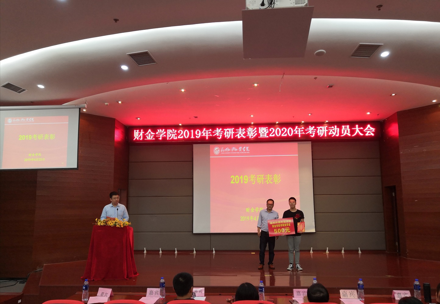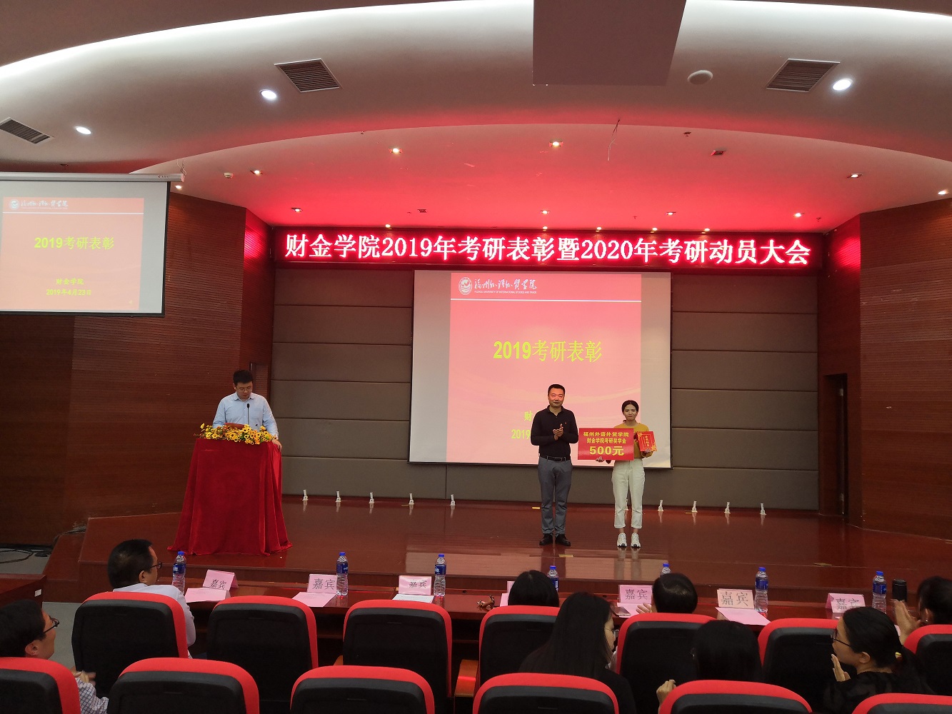 4月23日,财金学院召开2019届考研表彰大会暨2020届考研动员大会,学院副院长林晓薇,副院长、分党委书记刘若福出席会议,各系主任,院办公室正、副主任,各系教师代表,各年级辅导员与2016级预考研的学生及各班代表参加大会。