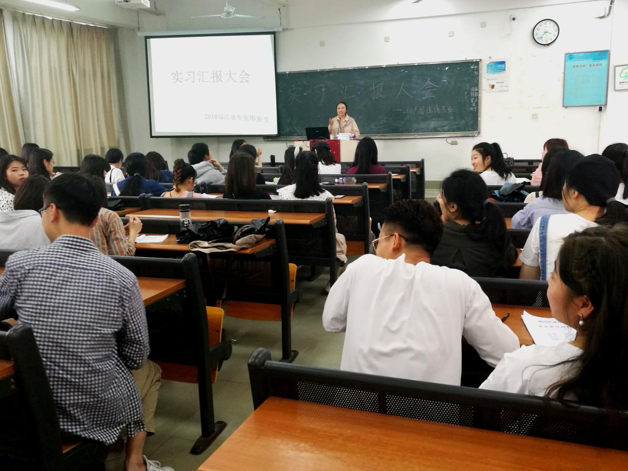 4月9日下午,外国语学院分别召开2019届英语系、翻译系、日语系、法语系毕业生实习汇报大会,汇报会分别由各系主任主持,辅导员及各系毕业班学生参加本次汇报会。