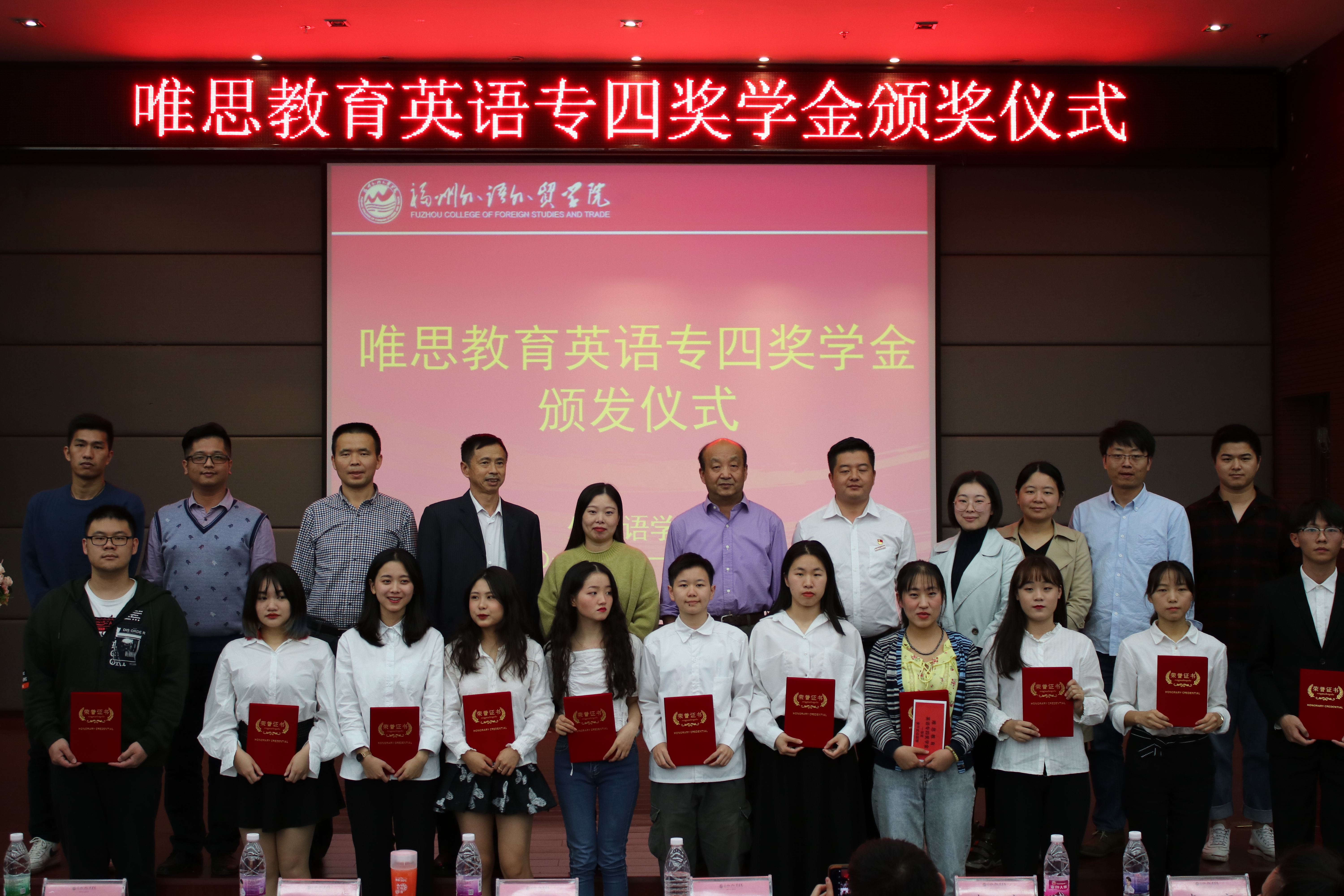 11月15日,外国语学院举行2019年唯思教育英语专四奖学金颁奖仪式。唯思奖学金创始人、我校2011届优秀校友、唯思教育创始人郑银星,教学发展中心主任肖华山,学生发展中心副主任林顺义,外国语学院副院长张红深, 外国语学院副院长、分党委书记章仁棠,唯思教育教师代表,外国语学院全体辅导员参加颁奖仪式。