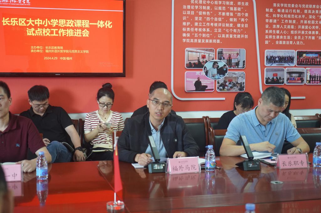 我校教学发展中心主任刘贤昌对区教育局及四所试点校和教师代表莅临我校开展推进会表示热烈欢迎,并简要介绍了我校的基本情况。他表示,福州外语外贸学院作为本次五所试点校的牵头单位,必定紧紧围绕思政课程一体化试点校工作任务要求,发挥组织牵头作用,为长乐区大中小思政课程一体化建设贡献力量。