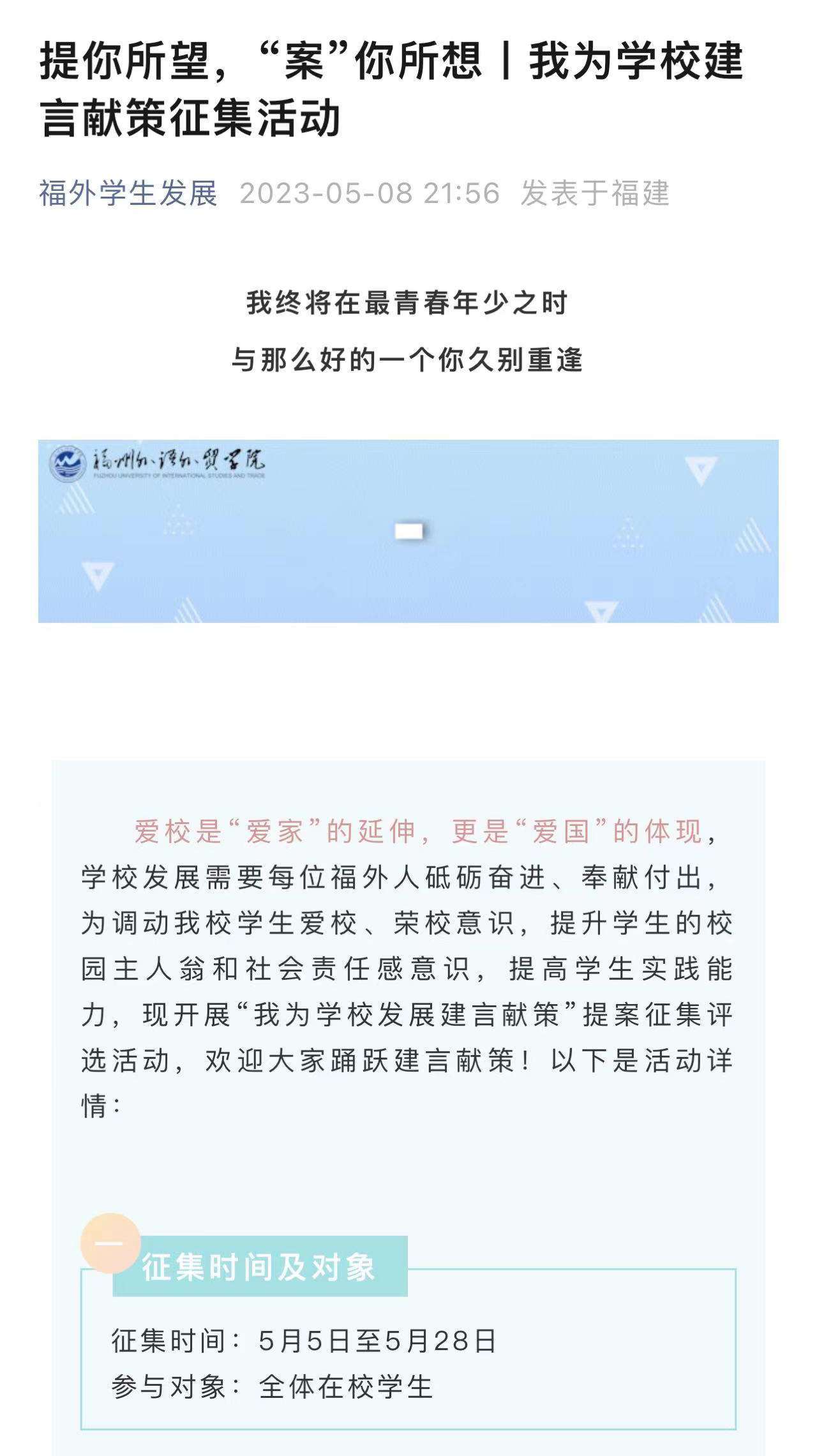 找准问题,提升调查研究“基本功”。多措并举开展调查研究,掌握全面、真实的一手信息,才能真正了解学生的需求。学校通过学生权益中心、学生干部队伍、网络志愿者队伍及时了解学生诉求,在学生群体开展“我为学校建言献策”提案征集活动,多角度研究学生需求,旨在从学生工作实际出发,力求听真话、察实情,不唯书、不唯上、只唯实,扑下身子干实事、谋实招、求实效。