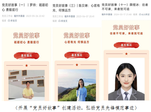 福州外语外贸学院外国语学院学生第一党支部,共有党员32名,福州外语外贸学院外国语学院学生第二党支部共有党员28名,福州外语外贸学院外国语学院学生第三党支部共有党员30人。“立项活动”时间为2022年9月-2024年6月,支部党员参与率100%,具有较强的管理本领、党性觉悟和服务理念。