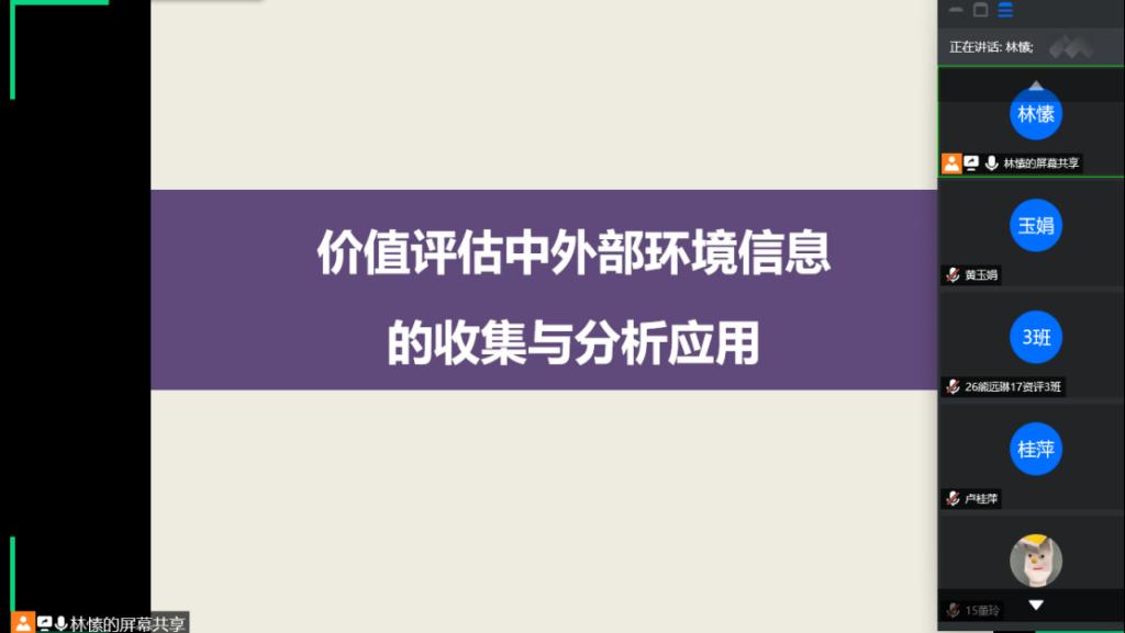 2020年5月19日下午,资产评估系林愫老师开展了题为“价值评估中外部环境信息的收集与分析应用”的专题讲座,经管学院资产评估专业学生聆听了此次讲座。