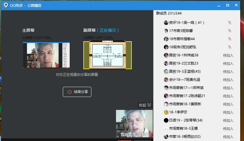 2020年5月19日下午,经管学院市场营销专业副教授岳瑞麒在QQ群课堂为2017、2018级市场营销专业与情绪管理公选课本科生开展“大学生情绪智慧、人际关系与自我概念之关系探究”线上专题讲座,两百余名学生在线听讲。
