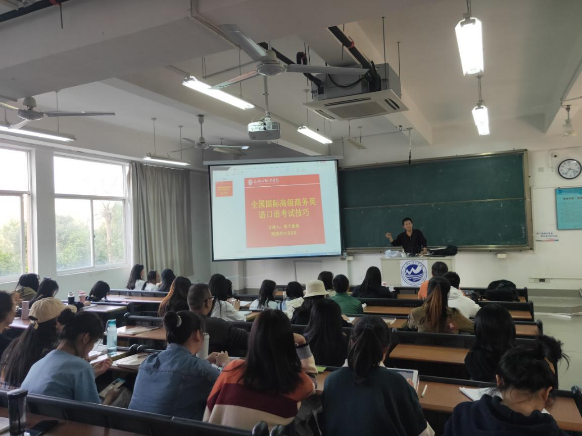 2020年11月3日周二下午,经管学院陈宁教授在教1101教室,为全校准备参加全国国际高级商务英语考试和对商务英语感兴趣的学生作“全国国际高级商务英语考试”专题讲座,六十多名学生全神贯注地听讲。