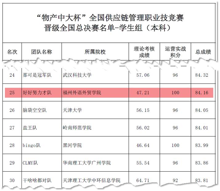 10月31日-11月1日,“物产中大杯”全国供应链管理职业技能竞赛结束。经管学院(国际商学院)教师李友林、刘丹指导的参赛团队“好好努力才队”(团队成员:陈伟祥、郑芳萍、池倪菲、郭子维)以实操满分的成绩晋级全国总决赛将角逐团队一、二等奖,“海底小纵队”(团队成员:陈清峰、曾雅玲、温翠萍、刘俊涛)荣获本科组全国三等奖。