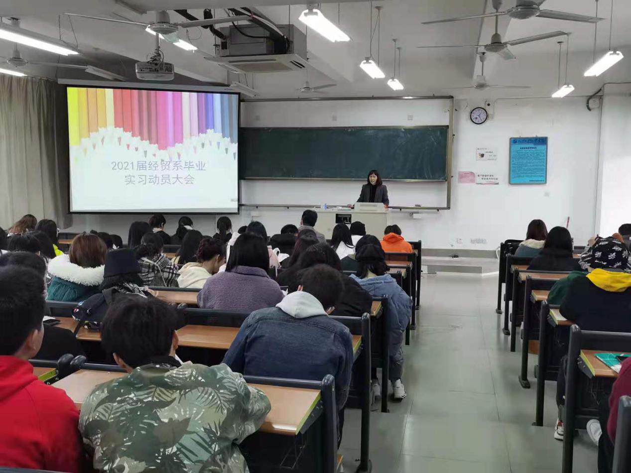 12月15日,国际经济与贸易系于教学楼召开2021届毕业生实习动员大会,2021届全体专业毕业生和实习指导教师、辅导员参加了本次大会。动员大会向学生介绍了毕业实习的重要性、毕业实习具体的时间安排及毕业实习过程中的注意事项,尤其强调疫情期间安全问题等,会议要求各位毕业生端正态度、认真完成毕业实习的各项工作安排,为顺利毕业打下坚实基础。