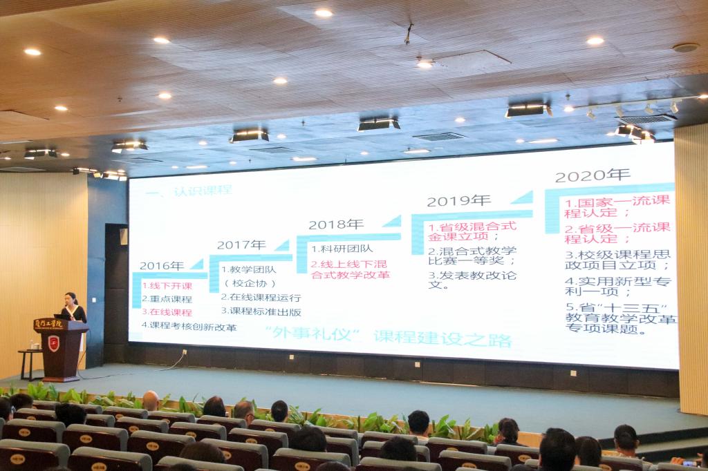 陈钦结合自己主持的国家级线上线下混合式一流课程《外事礼仪》的建课历程从认识课程、设计循理、实施有策、特色创新、效果突显等方面进行分享。会后陈钦还与厦门工学院今年申报国家级和省级一流课程的负责老师进行面对面交流,就申报过程的相关技巧进行答疑。讲座得到了厦门工学院校领导和老师们的高度评价,此次讲座的分享也是对我院一流课程建设的肯定。
