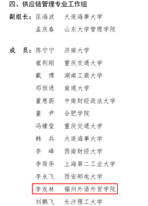 7月22日,教育部高等学校物流管理与工程类专业教学指导委员会发布《开元网页版公布物流管理专业等六个工作组增补及调整成员名单的通知》,经管学院(国际商学院)供应链管理系主任李友林入选供应链管理工作组成员,物流管理系副教授胡秀连入选青年教师工作组成员。截至目前,经管学院(国际商学院)已经有3位教师入选物流教指委工作组成员。