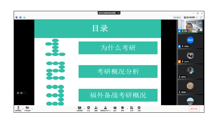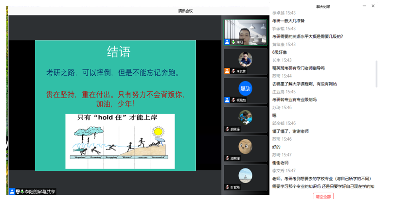 第三环节,李阳老师从为什么考研、考研概况分析、福外备战考研概况等方面为同学详细地剖析了在考研路上如何才能走得更加顺畅与坚定,为立志考研的同学拨开迷雾,指明方向,并告诫同学们要珍惜大学四年大好时光,不负青春韶华。