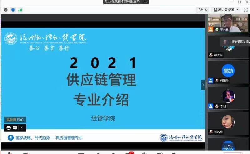 9月22日,供应链管理系通过腾讯会议平台召开2021级供应链管理专业新生入学专业介绍会。会议由供应链管理系主任李友林,教师柯晟劼、李阳主讲,教师代表胡秀连、李娜等及2021级供应链管理专业全体新生参加了此次会议。