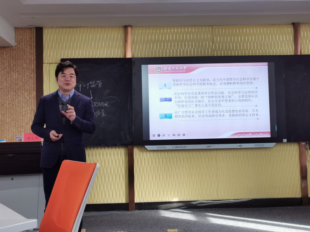 2022年1月12日,经管学院邀请福建师范大学经济学院副院长、硕士生导师谢宏忠教授作“课程思政的目标及其实现”的专题讲座。经管学院全体教师参加。