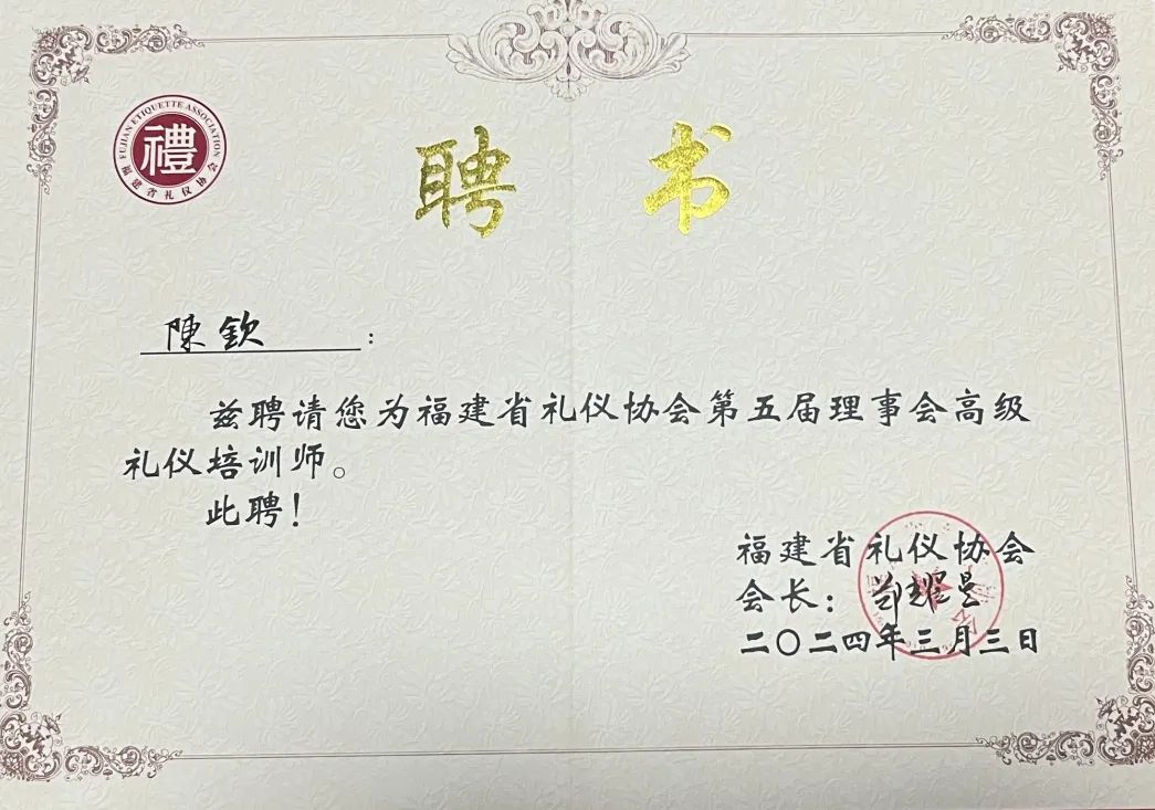 据悉,国际商学院于2019年12月与福建省礼仪协会签订了合作协议,共建“福建省礼仪培训基地”,旨在提升校内学生的礼仪素养,并服务校外企事业单位。陈钦老师多年来一直致力礼仪教育和培训工作,主持国家级线上线下混合式一流课程、省级课程思政示范课程“外事礼仪”,近些年陈钦老师带领“外事礼仪”课程团队和“商务跨文化交际”课程团队深入钻研,开发了多门培训课程,为企事业单位进行百余场的专项礼仪培训。同时在校内外开展了“职场礼仪”等专项职业能力证书培训和考证工作,服务人次达万人以上,获得企事业单位和学生的一致好评。