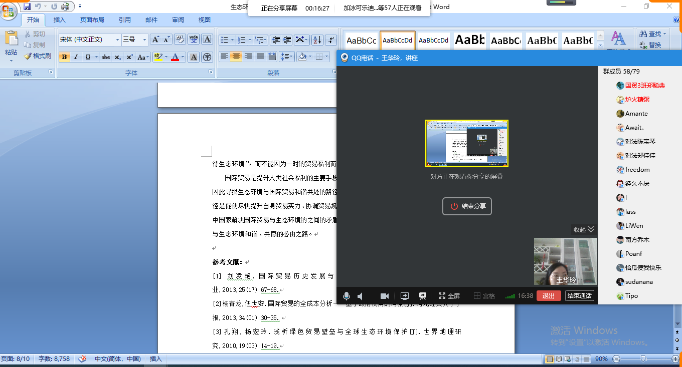 2020年5月15日下午,经管学院教师王华玲利用QQ平台的视频方式邀请2017级国际经济与贸易专业同学参加了生态环境保护下的国际贸易高质量发展分析的讲座,参与学生有70余人。