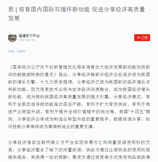 中共中央宣传部“学习强国”学习平台刊载福州外语外贸学院开放型经济与贸易研究中心、经管学院(国际商学院)许振宇副教授撰写的理论学习文章《培育国内国际双循环新动能,促进分享经济高质量发展》,该文先前发表在福建日报(理论版)。本文为福建省社会科学规划项目“大数据时代分享经济增加值核算研究”(FJ2018B064)的一大阶段性成果。