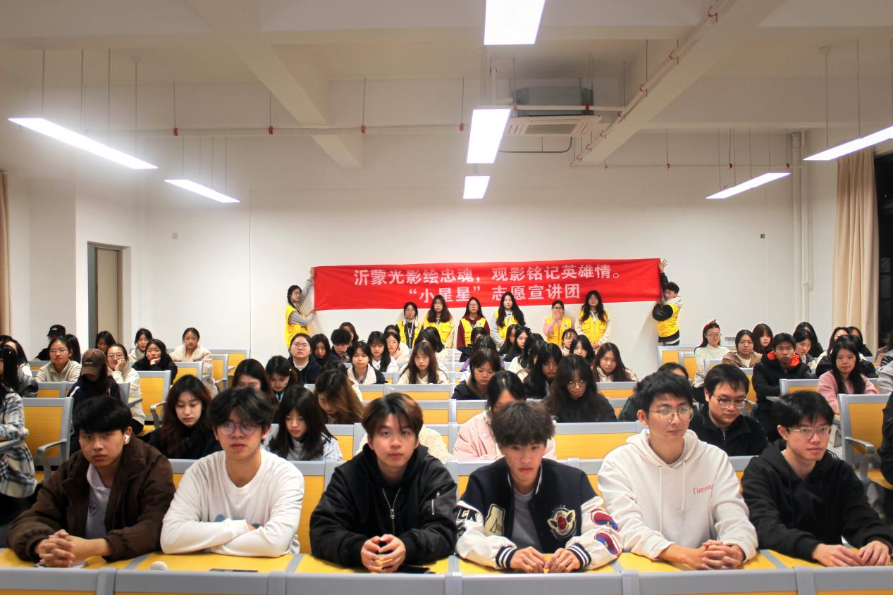 为深入学习宣传贯彻习近平新时代中国特色社会主义思想和党的二十届三中全会精神,引导动员青少年学生大力弘扬沂蒙精神。2024年12月12日,国际商学院“小星星”志愿宣讲团在福州外语外贸学院滨海校区开展“沂蒙光影绘忠魂,观影铭记英雄情”沂蒙精神主题观影活动。