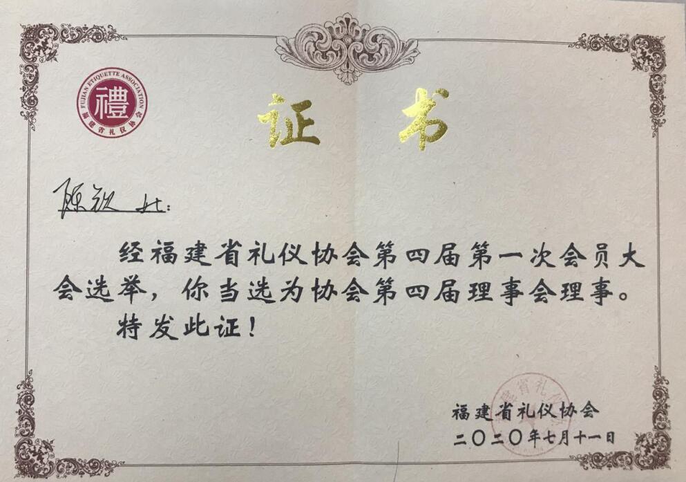 7月11日,福建省礼仪协会召开第四届第一次会员大会暨换届大会,经管学院国际经济与贸易系教师陈钦副教授当选为协会第四届理事会理事,同时受聘为协会礼仪讲师。