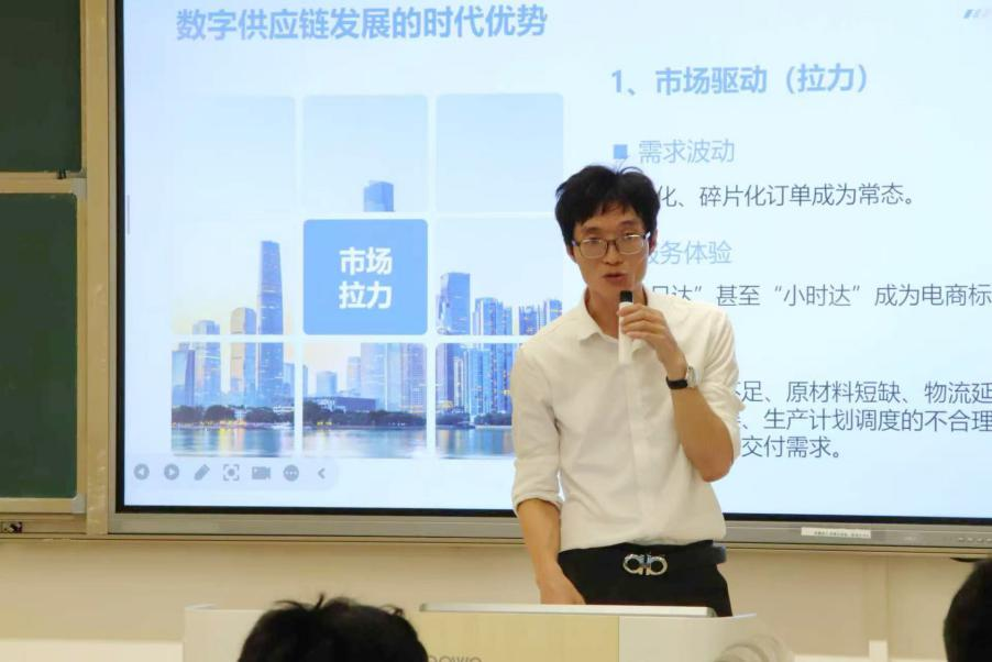 行业分享会上,林智勇总监以“数据孤岛”到“AI互联”供应链数字化的转型之路的为主题,结合自身丰富的业务实战经验,从数字供应链发展背景与行业现状、供应链数字化的关键技术体系、供应链数字化的发展挑战与应对策略等方面为同学们深度解析供应链行业前沿发展动态及未来发展趋势。林总监的讲解不仅帮助大家深刻理解供应链数字化转型的本质,更为接下来的专业学习找准方向,也为未来的职业规划绘制了清晰的蓝图。