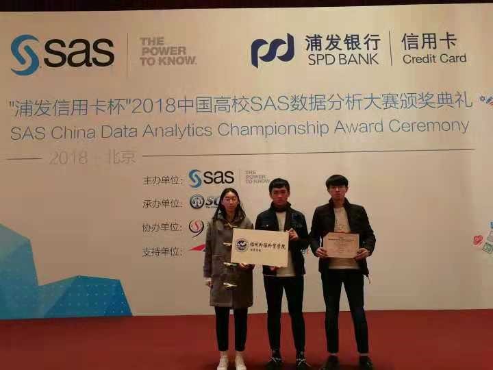 11月23日,“浦发信用卡杯”2018年中国高校SAS数据分析大赛总决赛在对外经济贸易大学举行,我校经管学院学生林伟、王欣、李政宝(指导老师:许振宇、高春姣、魏妹金),与北京大学、清华大学、复旦大学参赛学生同台竞技,挺进全国百强。我校经济统计学系主任许振宇副教授获优秀组织奖。11月26日,颁奖典礼在钓鱼台国宾馆举行,SAS公司中国区总裁lliltuou先生出席并讲话。据悉,本次大赛吸引全国高校共有本科生和研究生参赛队伍1321支,参赛学生超过3600人,清华大学、北京大学、中国人民大学、复旦大学、上海财经大学均派出强劲的参赛队伍,全国共有135支参赛队伍通过初赛进入决赛,主办方为世界500强企业SAS公司。SAS公司于1976年创建于美国,被誉为“全球500强背后的管理大师”,是数据分析领域的领导者。(经管学院)