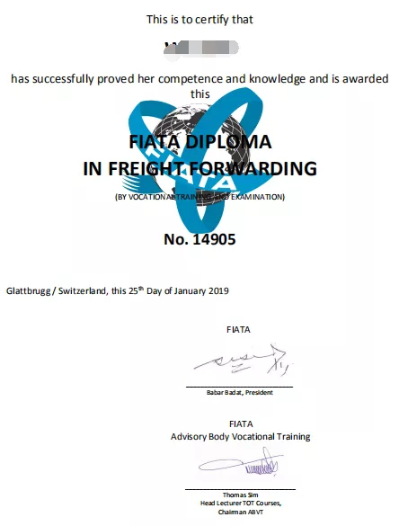 FIATA证书是国际货运代理资格证书,由FIATA(国际货运代理协会联合会:瑞士)颁发。该证书被全世界货运代理企业广泛承认,是目前世界上货代从业人员资格证书中最具权威的证书。许多国家的政府主管或其代理机构,在审批或年审国内货运代理公司时,把“FIATA证书”的持有者人数作为一项硬性指标。