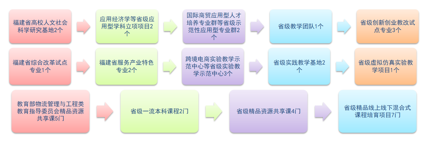 * 首批省级一流本科专业建设点(2019年)* 中国物流学会产学研基地(2019年)* 福建省本科高校专业综合改革试点项目(2012年)* 福建省创新创业改革试点专业(2016年)* 福建省高校服务产业特色专业(2016年)* 福建省示范性应用型专业群建设项目(2017年)* 福建省应用型学科立项项目(2017年)* 福建省实验教学示范中心(2017年)* 福建省实践教学基地(2017年)* 福建省虚拟仿真实验教学项目(2017年)* 福建省教学团队(2018年)