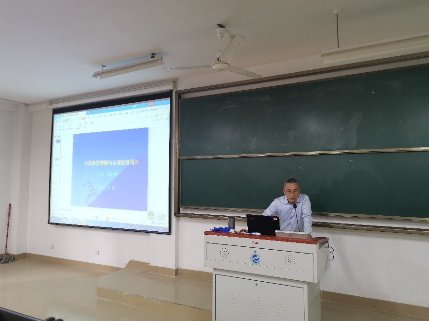 2021年10月19下午,于我校实验楼3205教室,郑和明博士举办中美经贸摩擦与全球经济增长讲座。2019级国际经济与贸易系全体学生参加讲座。讲座中郑和明围绕中美经贸摩擦展开了分析。郑和明指出:中美经贸摩擦愈演愈烈,必将严重损害中美两国利益,威胁全球产业链、供应链安全,全球不确定性因素显著增加,拖累国际贸易和世界经济增长。郑和明强调:应理性和妥善应对中美经贸摩擦。应深刻认识中美经贸摩擦长期化复杂化。坚持中美双方对话谈判管控分歧,实现互利共赢。