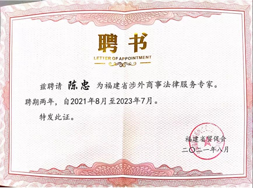此次陈忠教授获聘为福建省涉外商事法律服务专家库首批专家,是学校积极参与福建省贸促会事务的体现,有利于为贸促会提供有力的智力支持。