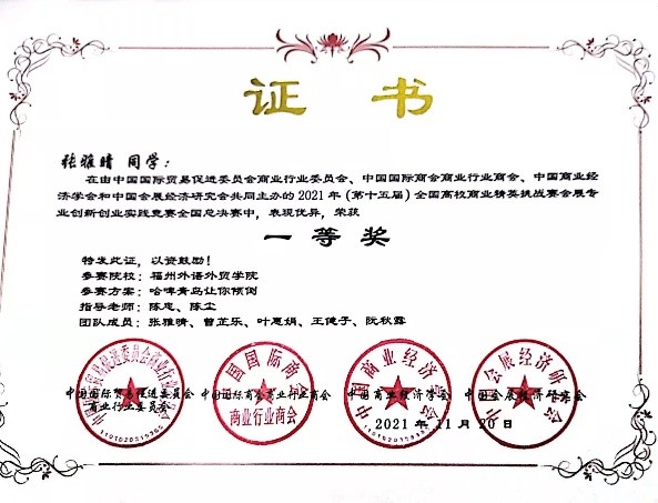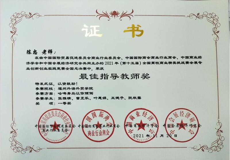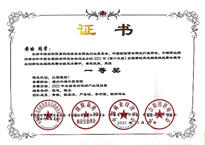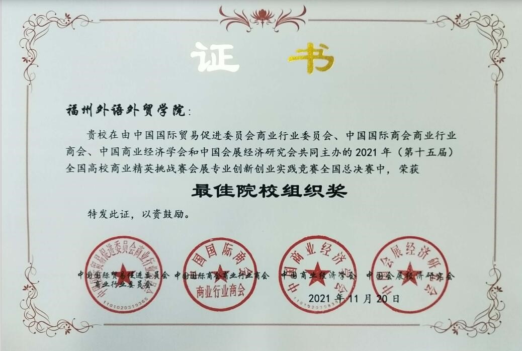 2021年11月18日至21日,2021年全国高校商业精英挑战赛会展创新创业实践竞赛全国总决赛于线上成功举办。我校经管学院(国际商学院)学生黄皓、陈宝治、严圣洁、李巧滢、欧阳伟业(指导教师:陈忠、陈尘、陈思慎)荣获会展项目策划赛全国一等奖,张雅晴、曾芷乐、叶惠娟、王健子、阮秋露(指导教师:陈忠、陈尘、陈思慎)荣获会展城市营销赛全国一等奖。